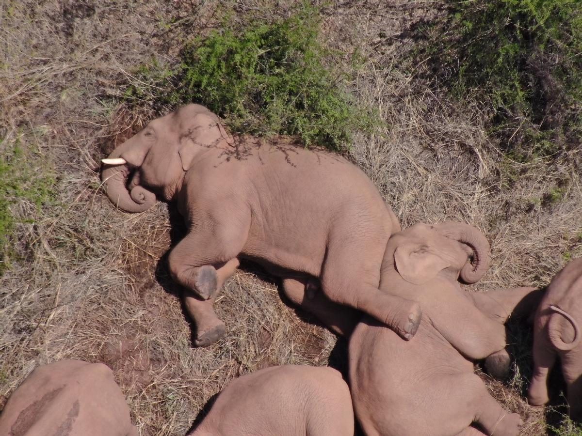 This aerial photo shows the wild Asian elephant herd taking a nap. [Photo provided by Yunnan Provincial Forest Fire Brigade]