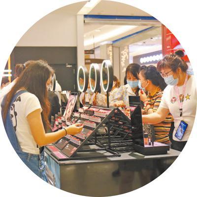 Photo shows tourists looking at goods at a cosmetics counter at a duty-free shop in Hainan. (People's Daily/Wang Xinyue)