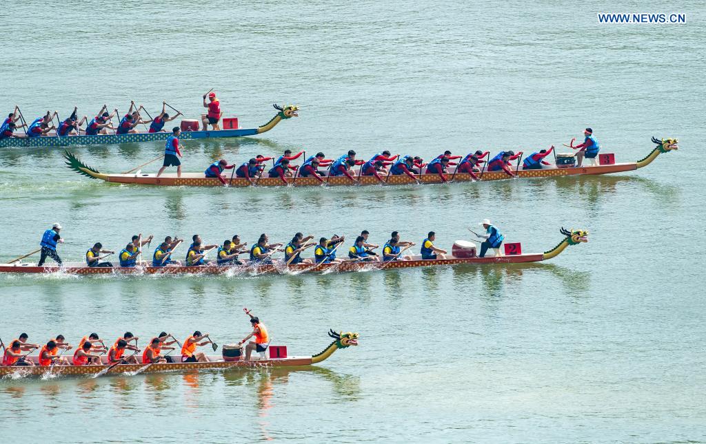 People participate in a dragon boat race to celebrate the Dragon Boat Festival in Zigui County, central China's Hubei Province, June 14, 2021. China celebrated the Dragon Boat Festival on Monday to commemorate Qu Yuan, a patriotic poet from the Warring States Period (475-221 BC) believed to have been born in Zigui County. (Xinhua/Zheng Jiayu)