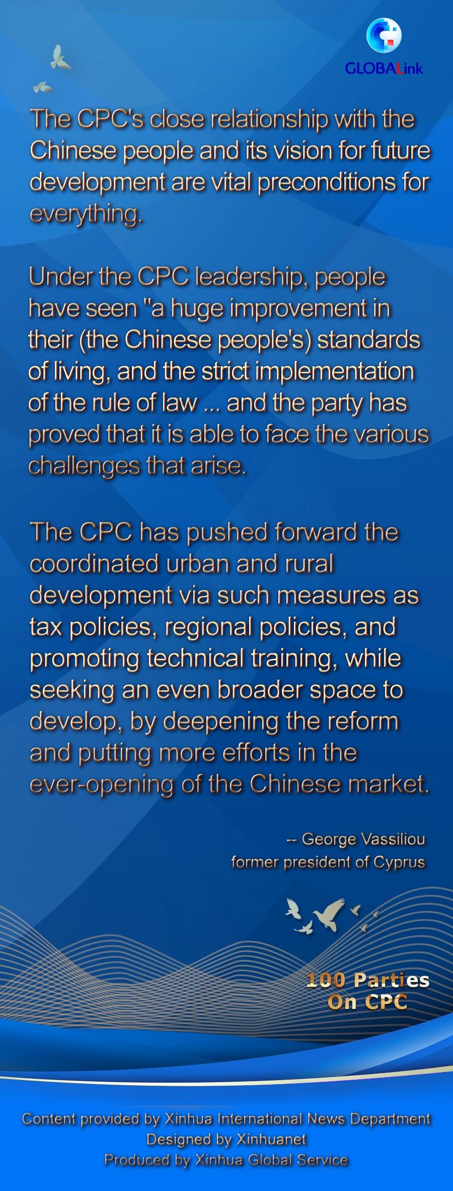 "One can only admire the CPC for its achievements," said Vassiliou, also the founder of the Cypriot United Democrats party, in a recent interview with Xinhua.