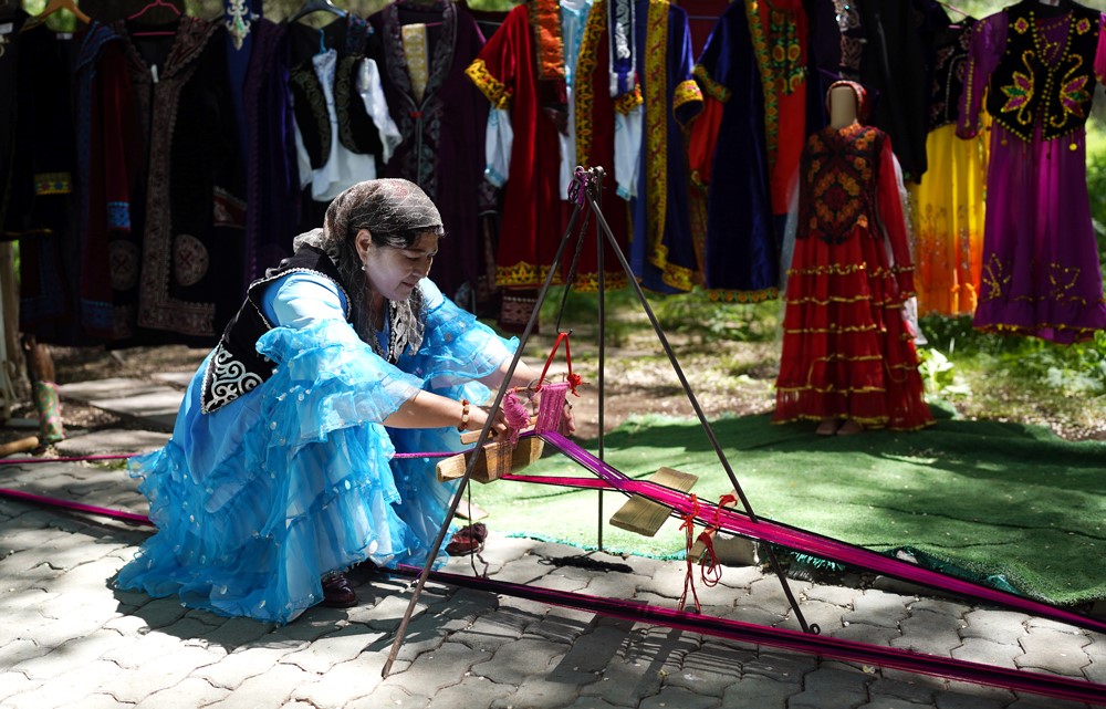 A Kazakh woman weaves a piece of cloth at the Kazakh Folk Village at the Tianchi Lake scenic area in the Tianshan Mountains located nearby the city of Urumqi, northwest China’s Xinjiang Uygur Autonomous Region. (People's Daily Online/Zhang Ruohan)