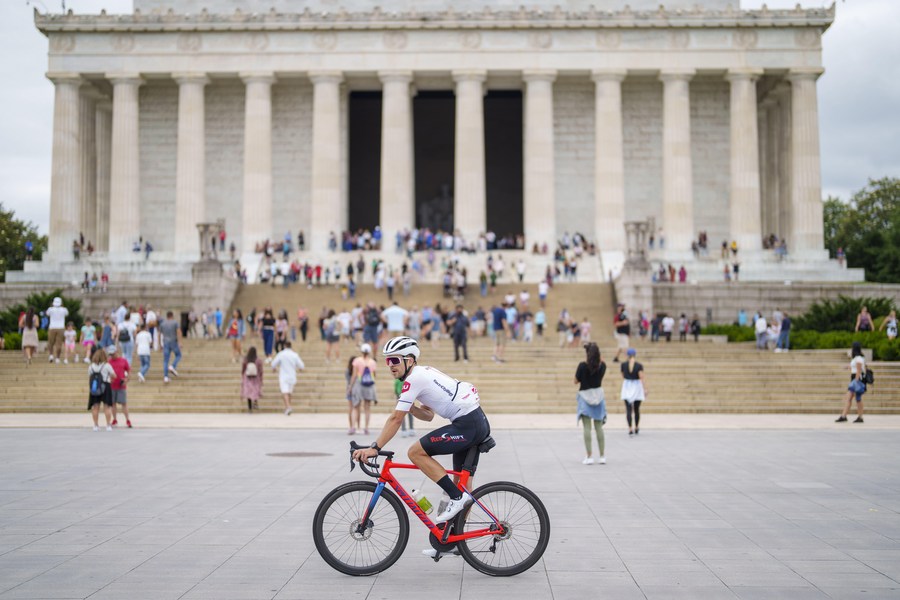 A cyclist rides by the Lincoln Memorial at the National Mall in Washington D.C., the United States, June 12, 2021. (Photo by Ting Shen/Xinhua)