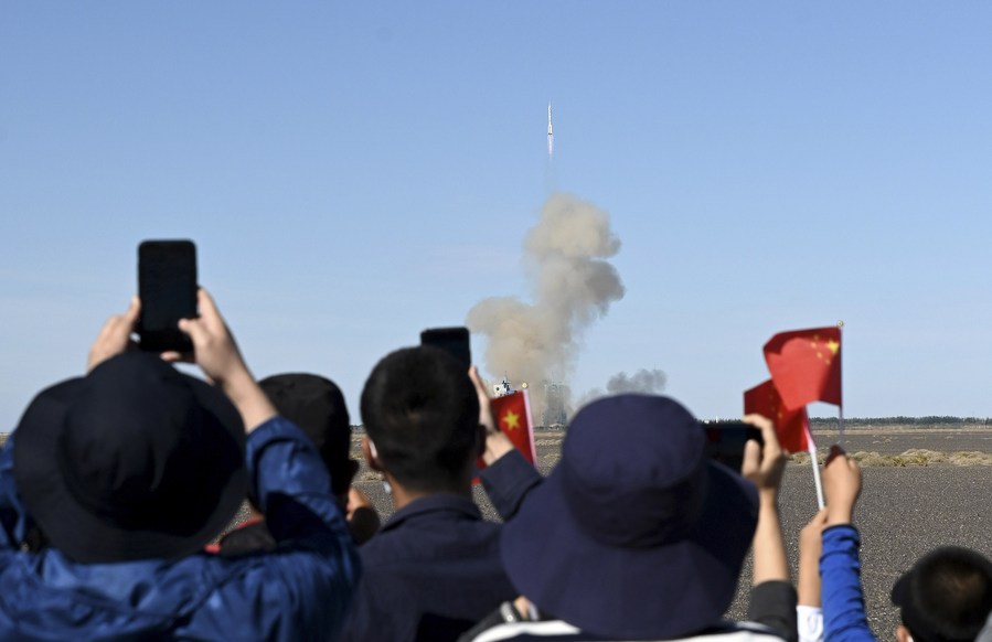 The crewed spacecraft Shenzhou-12, atop a Long March-2F carrier rocket, is launched from the Jiuquan Satellite Launch Center in northwest China's Gobi Desert, June 17, 2021. (Xinhua/Ren Junchuan)