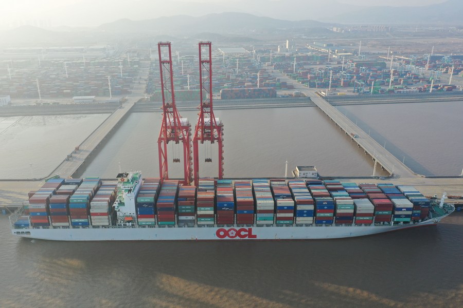 Aerial photo shows a cargo ship docking at Meidong Dock of the Ningbo-Zhoushan port in Ningbo, east China's Zhejiang Province. (Xinhua/Huang Zongzhi)