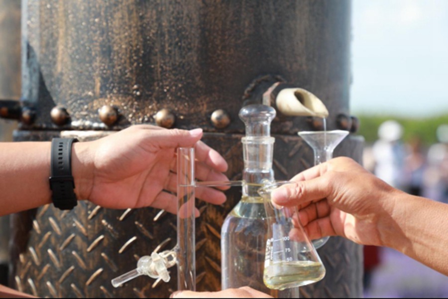 Photo shows essential oil extracted from lavender in 2021. (Photo/Courtesy of the media convergence center of Huocheng county)