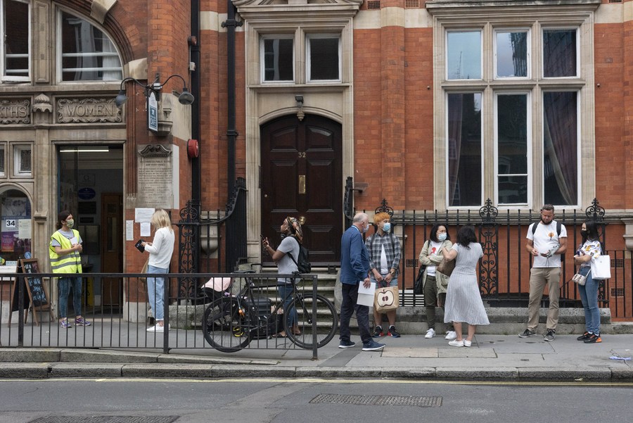 People queue outside a walk-in vaccination clinic in London, Britain, June 17, 2021. (Photo by Ray Tang/Xinhua)