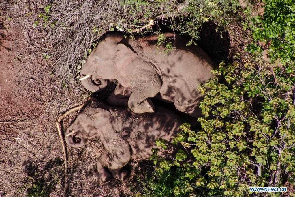 Aerial photo taken on June 20, 2021 shows the Asian elephants in Dalongtan Township of Eshan County, Yuxi City of southwest China's Yunnan Province. The herd of wandering Asian elephants moved back and forth in a small area in Dalongtan Township between 6 p.m. (1000 GMT) Saturday and 6 p.m. (1000 GMT) Sunday, according to the Yunnan headquarters in charge of monitoring their migration. A male elephant, which strayed 15 days ago, is now about 24.3 kilometers away from the herd. All 15 elephants are safe and sound, according to the headquarters. (Xinhua)