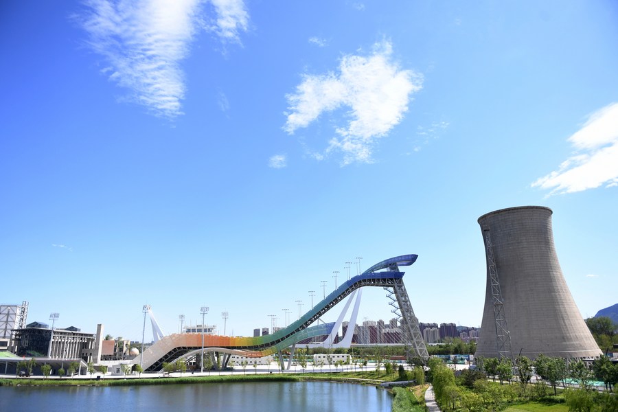 Photo taken on May 28, 2021 shows Shougang ski jumping platform in Beijing, capital of China. (Xinhua/Zhang Chenlin)