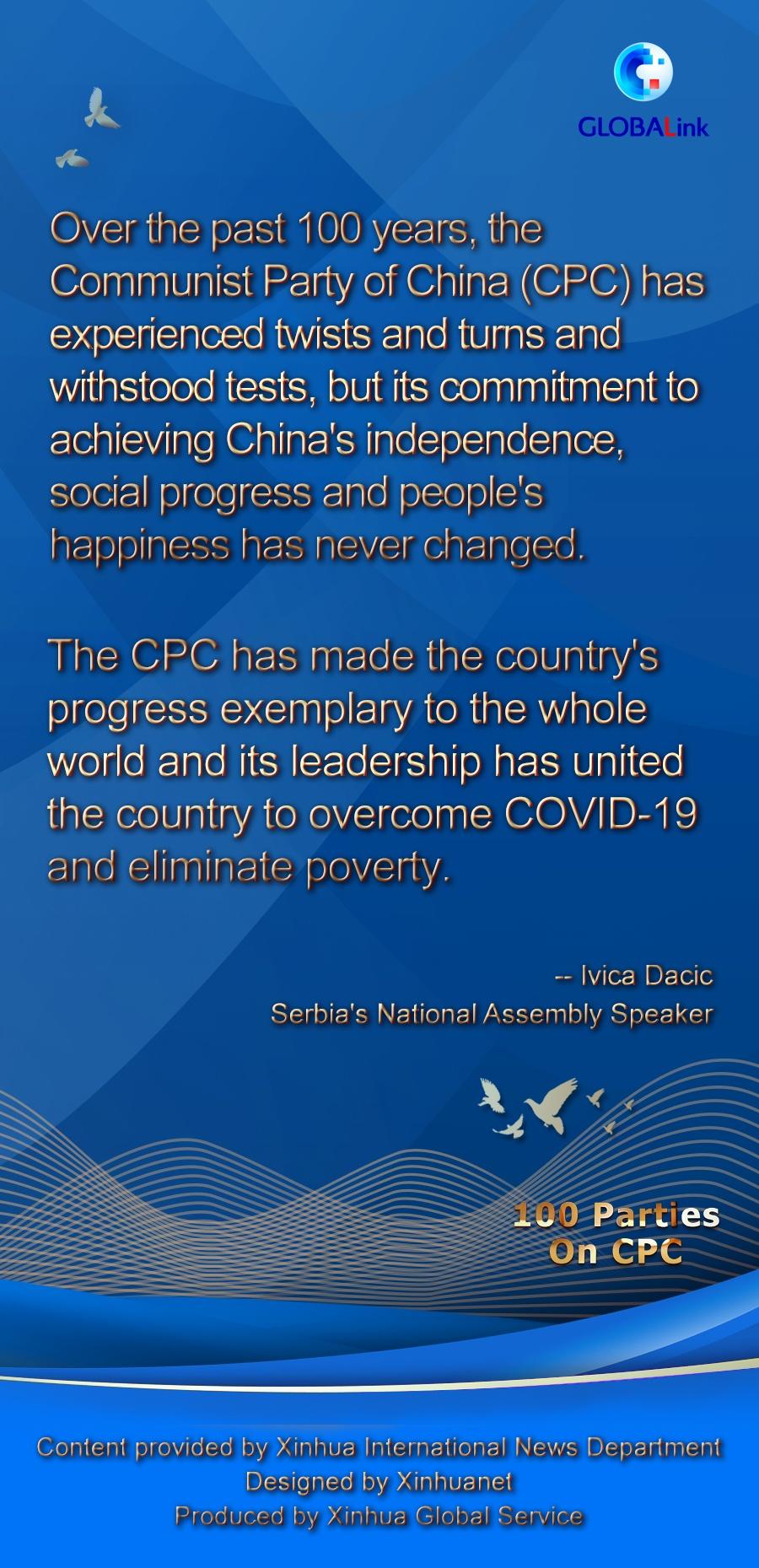 In a recent interview with Xinhua, Dacic, also president of the Socialist Party of Serbia (SPS) in the Serbian ruling coalition, said the CPC has made the country's progress exemplary to the whole world and its leadership has united the country to overcome COVID-19 and eliminate poverty.