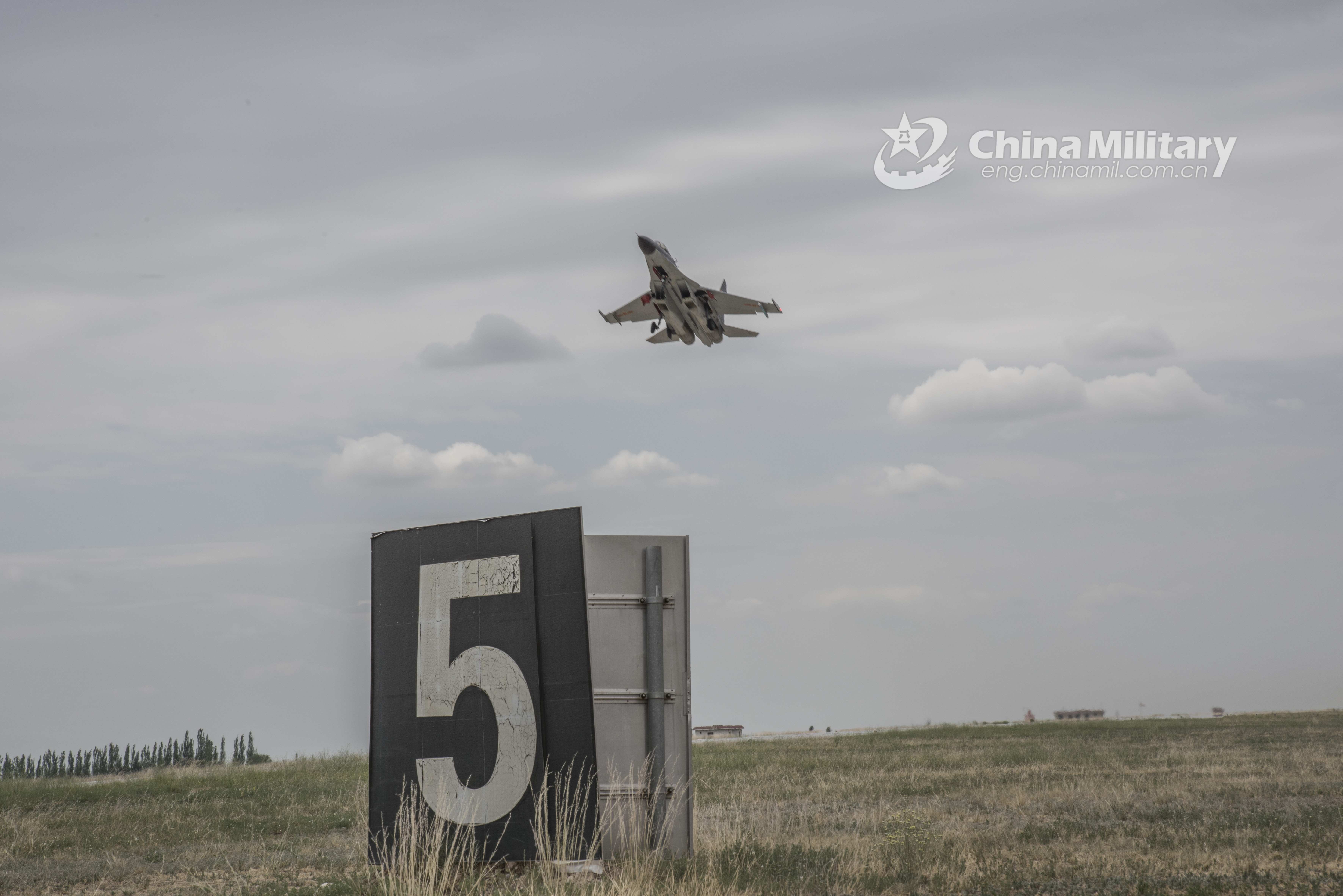 A fighter jet attached to an aviation brigade of the air force under the PLA Western Theater Command takes off from the runway during a flight training exercise on June 10, 2021. (eng.chinamil.com.cn/Photo by Cao Yukun)