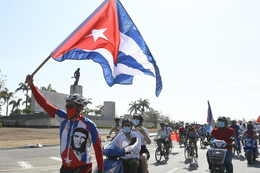 People paticipate in a rally against U.S. embargo in Santa Clara, Cuba, April 25, 2021. (Xinhua/Joaquin Hernandez)