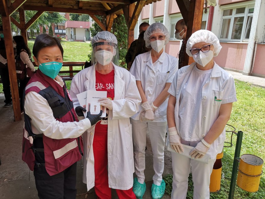 Chinese expert medical team member Cheng Shouzhen (1st L) delivers brochures on COVID-19 epidemic prevention to the medical staff of a nursing center in Belgrade, Serbia, May 12, 2020. (Xinhua)