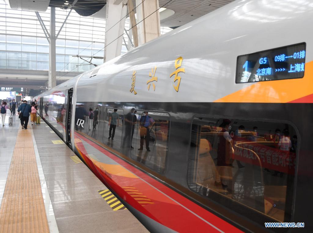 Train G5, a Fuxing intelligent bullet train, is seen at Beijing South Railway Station in Beijing, capital of China, June 25, 2021. The Fuxing intelligent bullet trains were put into operation on some railway lines on Friday. (Xinhua/Zhang Chenlin)