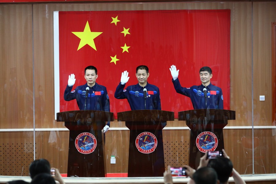 The day before the launch of the Shenzhou-12 spaceship, the crew trio made their public debut at the Jiuquan Satellite Launch Center, wearing China's national flag and the Party flag on their uniforms.