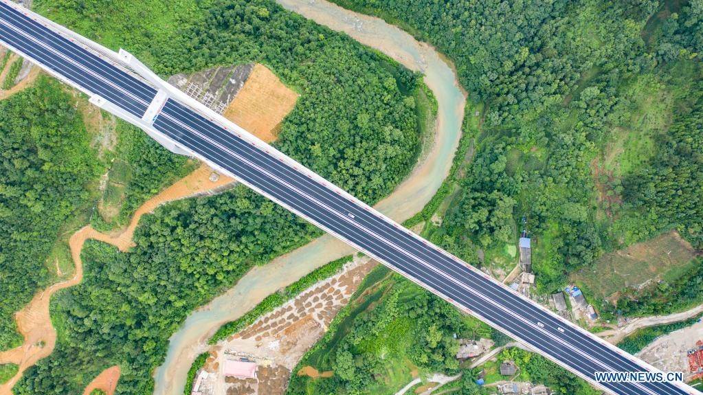 Aerial photo taken on June 28, 2021 shows cars running on the Yunwu Bridge of the Duyun-Anshun expressway in southwest China's Guizhou Province. The Duyun-Anshun expressway was put into operation on Monday. It is the first section of the 276-kilometer-long national expressway G7611 linking Duyun with Shangri-La. (Xinhua/Tao Liang)