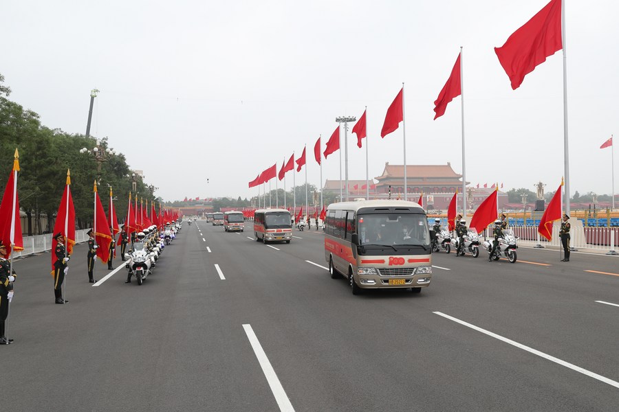 The motorcade carrying recipients of the July 1 Medal is accompanied by motorcycle escorts on the way to the Great Hall of the People in Beijing, capital of China, June 29, 2021. (Xinhua/Ding Haitao)