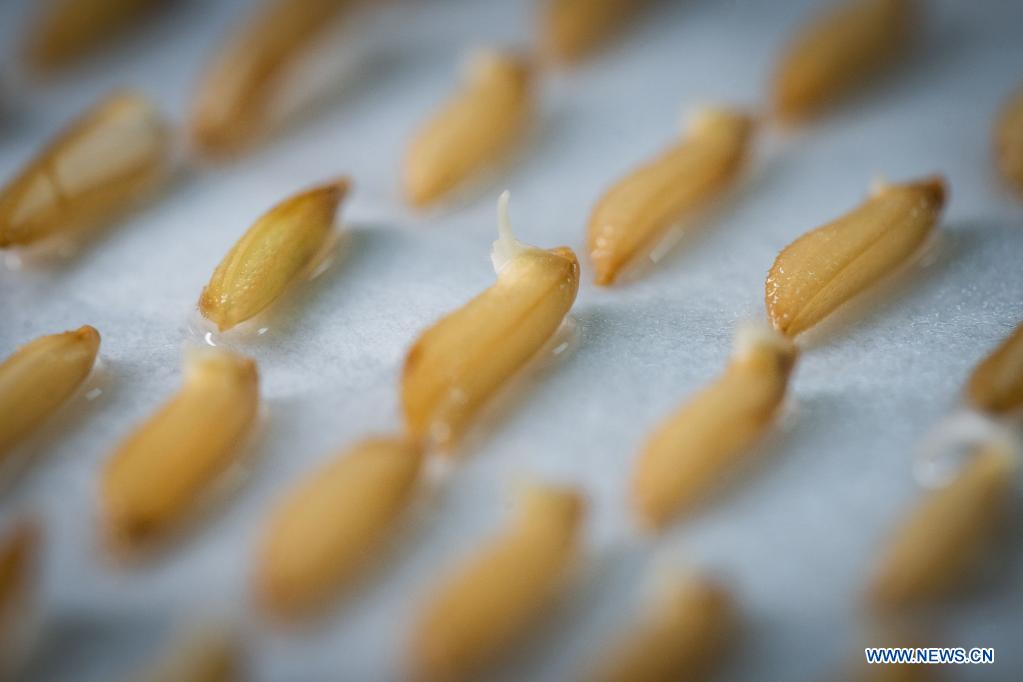 Photo taken on Feb. 26, 2021 shows sprouting rice seeds that had made a round trip to the moon aboard the Chang'e 5 probe at the central greenhouse of the National Engineering Research Center of Plant Space Breeding of the South China Agricultural University (SCAU) in Guangzhou of south China's Guangdong Province. (Xinhua/Liu Dawei)