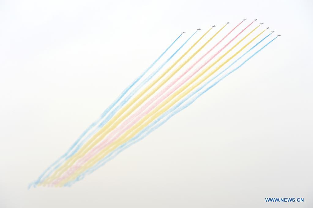 Military aircraft fly in echelon ahead of a grand gathering celebrating the Communist Party of China (CPC) centenary in Beijing, capital of China, July 1, 2021. (Xinhua/Dai Tianfang)