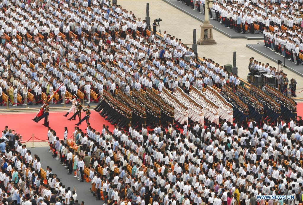 The national flag guards march during a flag-raising ceremony at a grand gathering celebrating the centenary of the Communist Party of China (CPC) at Tian'anmen Square in Beijing, capital of China, July 1, 2021. (Xinhua/Rao Aimin)