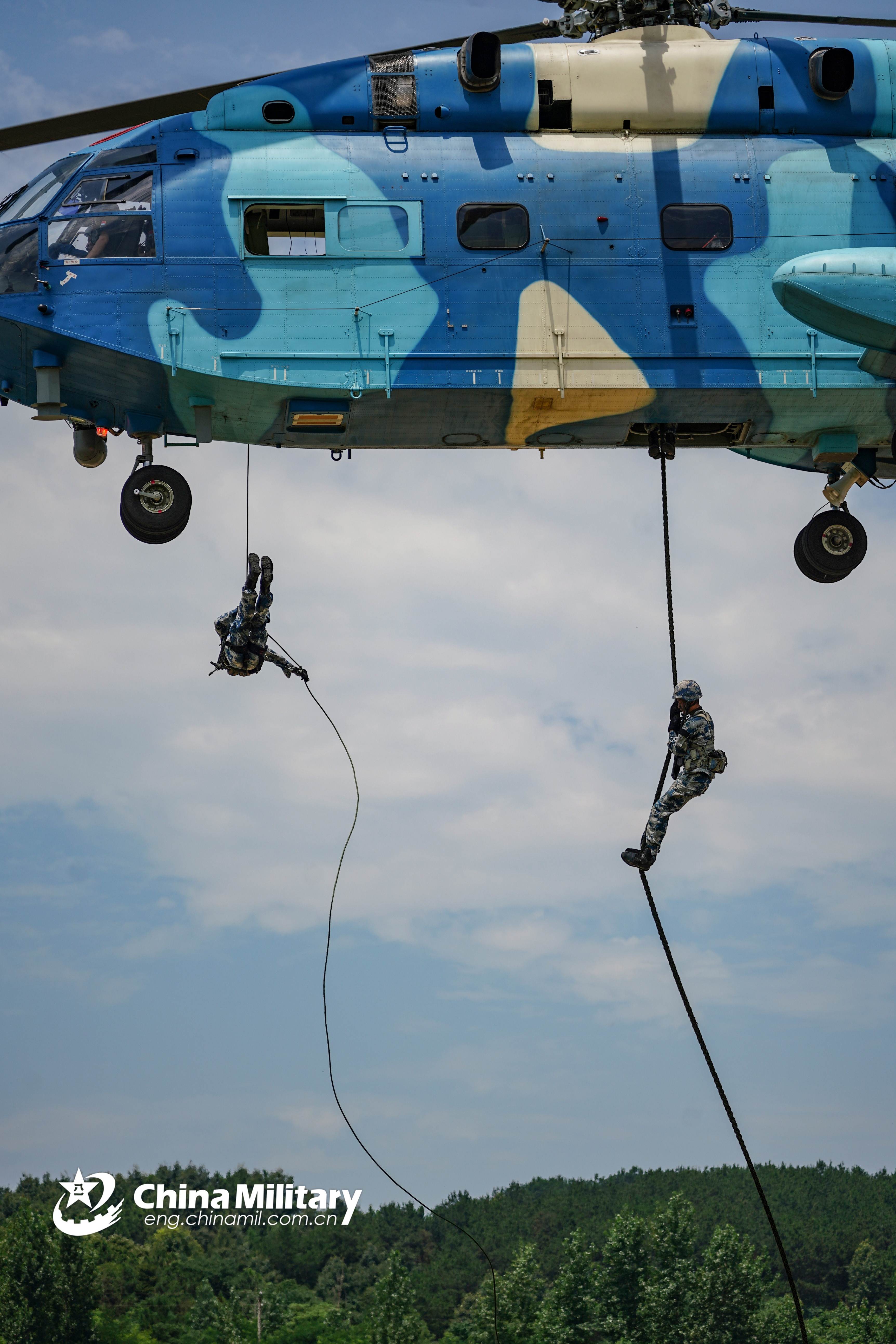 Airmen assigned to the PLA Air Force's airborne troops practice exiting a transport helicopter during a recent fast-roping exercise in central China's Hubei Province. (eng.chinamil.com.cn/Photo by Liu Xingkai and Wang Hanfeng)