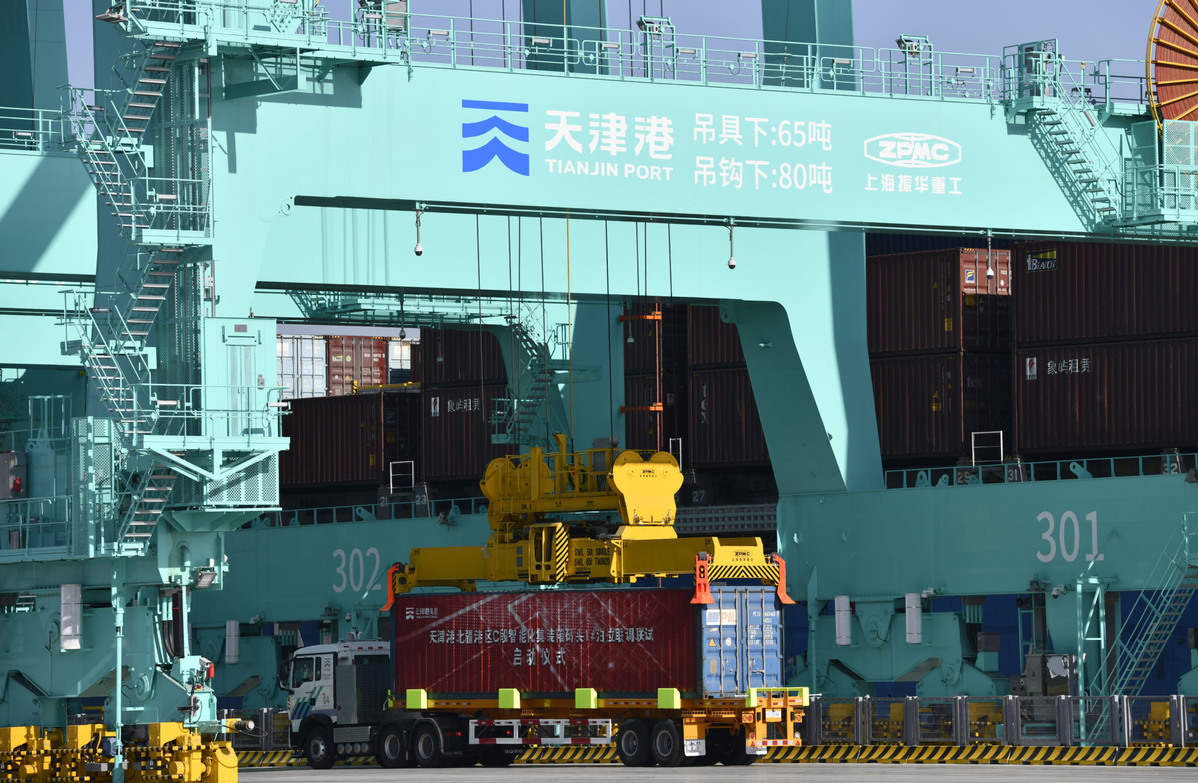 Guided by the Beidou satellite navigation system, an autonomous driving vehicle begins carrying containers and starting loading tasks at Tianjin Port of North China's Tianjin municipality, on Jan 17, 2021. [Photo/Xinhua]