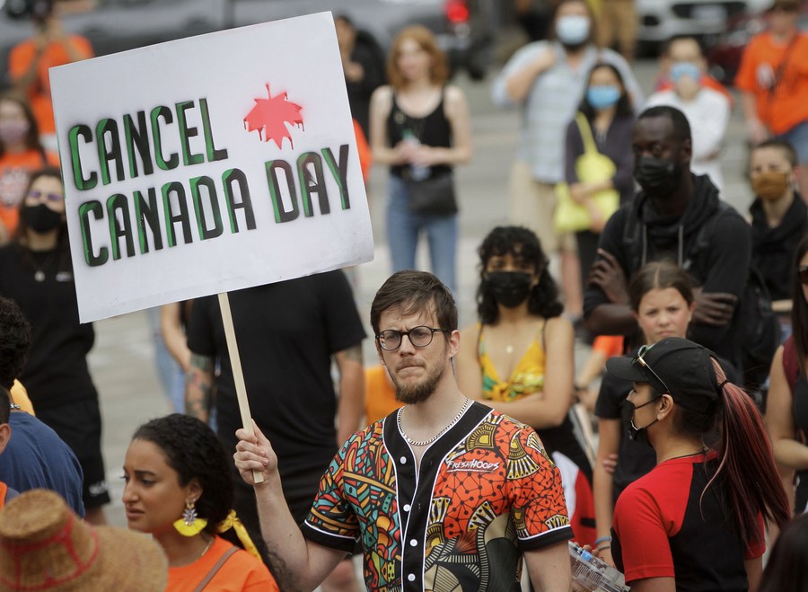 Members of the indigenous community participate in a "Cancel Canada Day" rally in Vancouver, Canada, July 1, 2021. (Photo by Liang Sen/Xinhua)