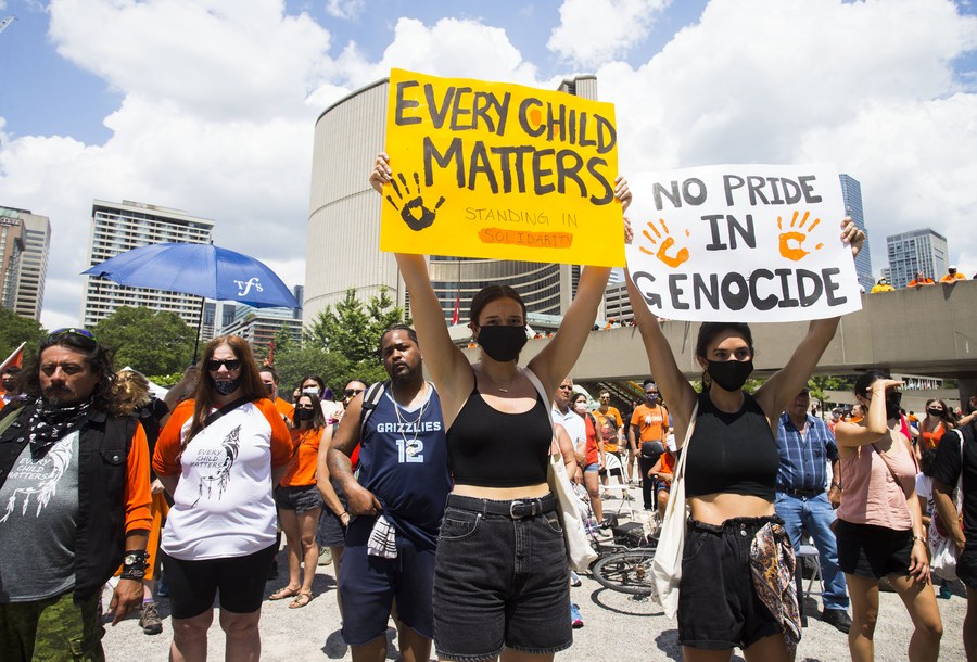 People take part in an event to mourn for victims who died of abuses by former indigenous residential schools in Toronto, Canada, on July 1, 2021. (Photo by Zou Zheng/Xinhua)