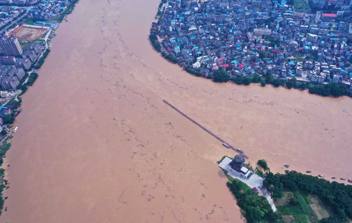 Floodwaters almost submerge a ferry bridge in Rong'an county in Liuzhou, Guangxi Zhuang autonomous region, on Friday. [Photo by Tan Kaixing/For China Daily]