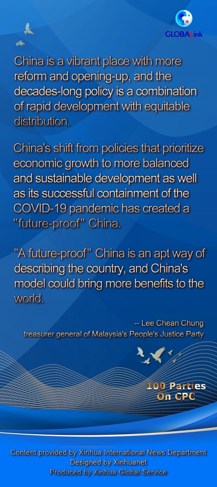KUANTAN, Malaysia, July 5 (Xinhua) -- China's shift from policies that prioritize economic growth to more balanced and sustainable development as well as its successful containment of the COVID-19 pandemic has created a "future-proof" China, said a Malaysian politician.