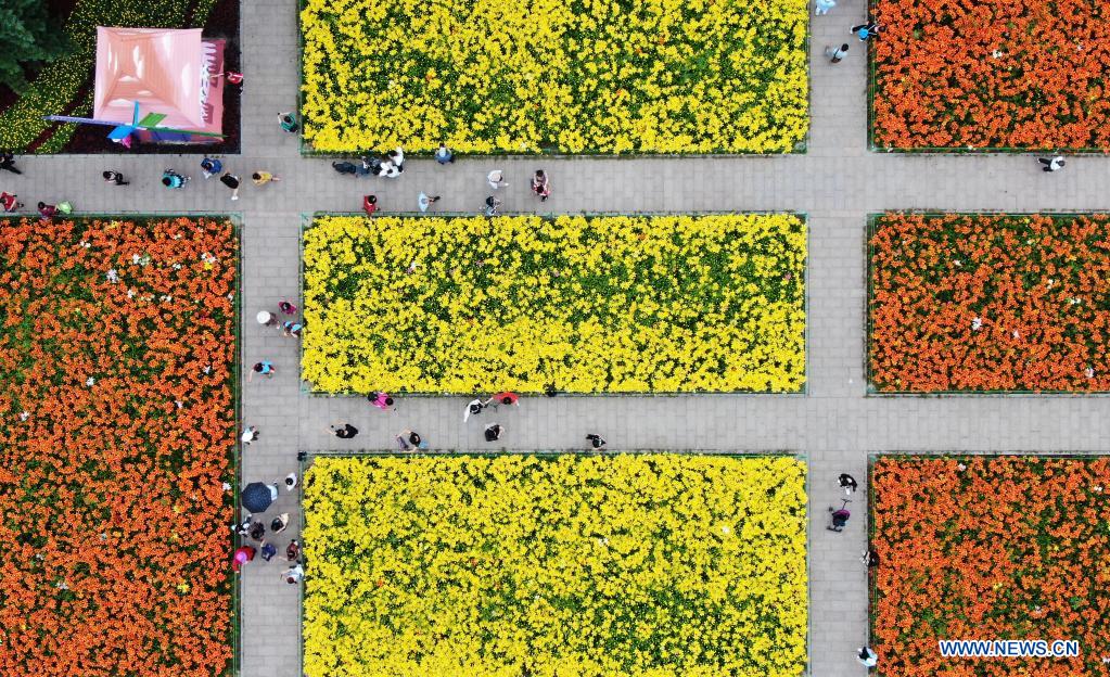 Aerial photo shows people enjoying themselves beside lilies at Shenshuiwan Park in Shenyang, northeast China's Liaoning Province, July 6, 2021. (Xinhua/Yang Qing)