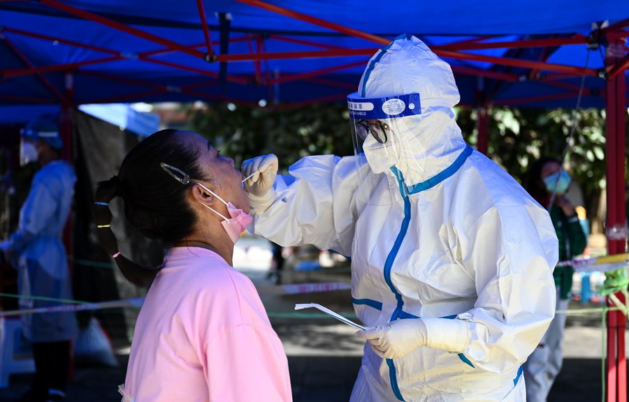 A medical worker collects a swab sample for nucleic acid test in Ruili City of southwest China's Yunnan Province, July 8, 2021. (Xinhua/Wang Guansen)