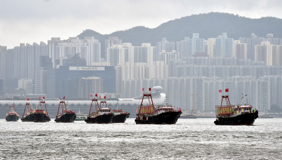 Fishing boats flying China's national flags and the flags of the Hong Kong Special Administrative Region (HKSAR) cruise at Victoria Harbour in Hong Kong, south China, July 1, 2021. (Xinhua/Lo Ping Fai)