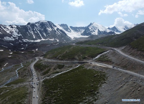 Aerial photo taken on July 9, 2021 shows a view along the Duku Highway in northwest China's Xinjiang Uygur Autonomous Region. The 560-km highway, connecting Dushanzi in the northern area of Xinjiang Uygur Autonomous Region and Kuqa City in the south, runs through various landscapes including glaciers, forests, and grasslands. (Xinhua/Shang Sheng)