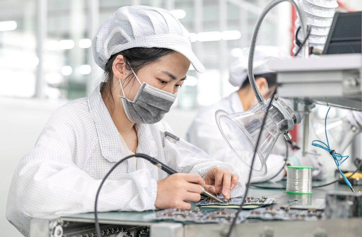 Employees work on the production line of a Spanish electronics company in Hai'an, Jiangsu province. [Photo by Zhai Huiyong/for China Daily]