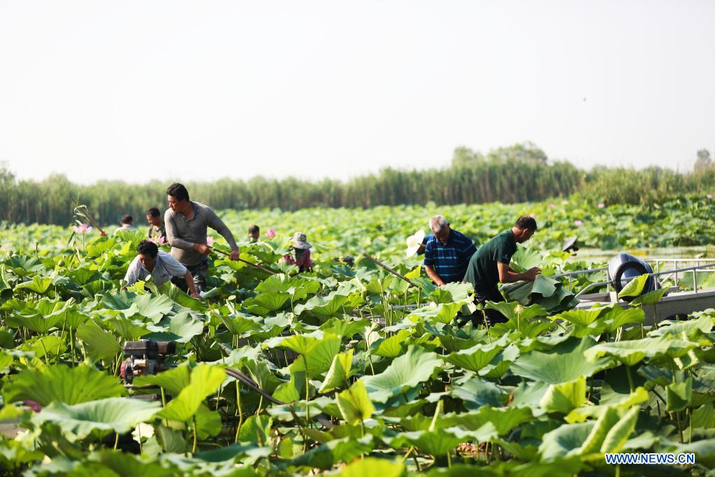 Villagers harvest lotus leaves on the Hongze Lake in Sihong County, east China's Jiangsu Province, July 14, 2021. (Photo by Xu Changliang/Xinhua)