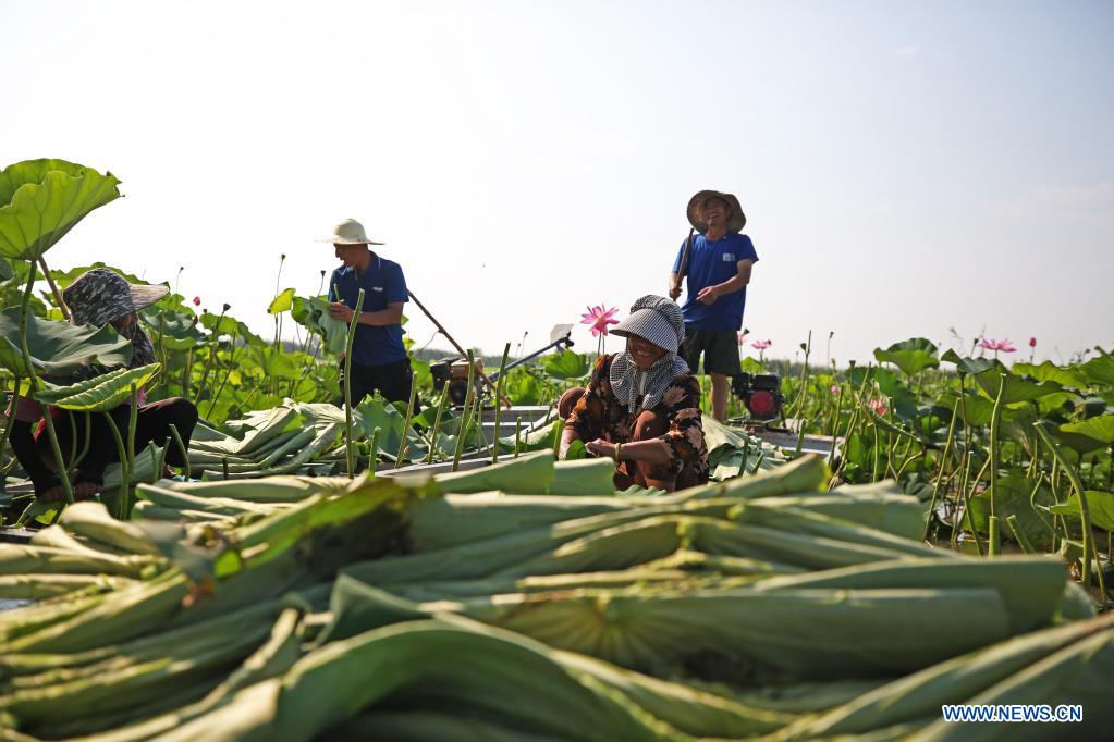 Villagers harvest lotus leaves on the Hongze Lake in Sihong County, east China's Jiangsu Province, July 14, 2021. (Photo by Xu Changliang/Xinhua)