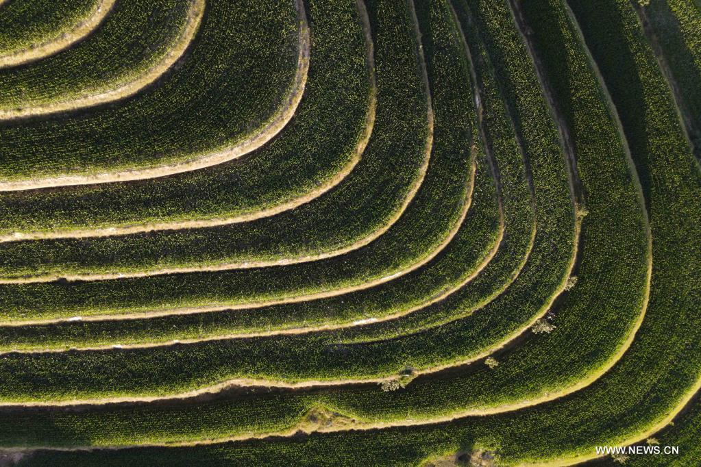 Aerial photo taken on July 13, 2021 shows terraced fields in Pengyang County of Guyuan, northwest China's Ningxia Hui Autonomous Region. (Xinhua/Tang Rufeng)