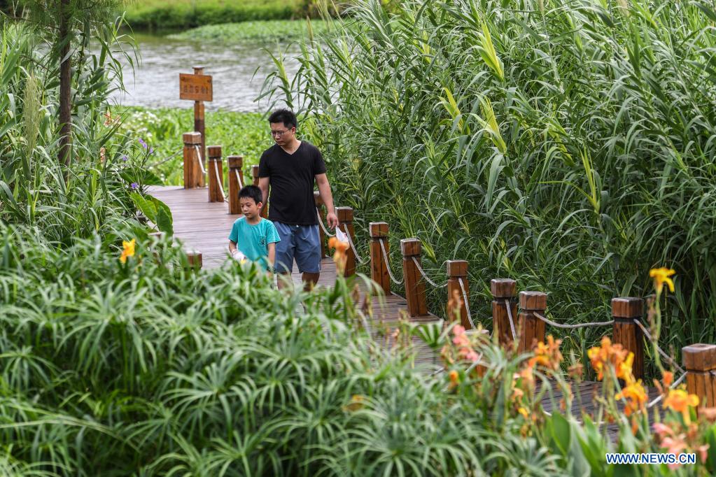 People visit the Nakao River wetland park in Nanning, south China's Guangxi Zhuang Autonomous Region, July 8, 2020. Nakao River in Nanning was once a polluted muddy gutter lined with sewage outlets. In 2015, a public-private partnership (PPP) project was rolled out to improve the ecological environment along the river. Pollution control measures including sewage interception and treatment, as well as aquatic ecosystem restoration, have helped turn the river into a wetland park with lucid waters. (Xinhua/Cao Yiming)