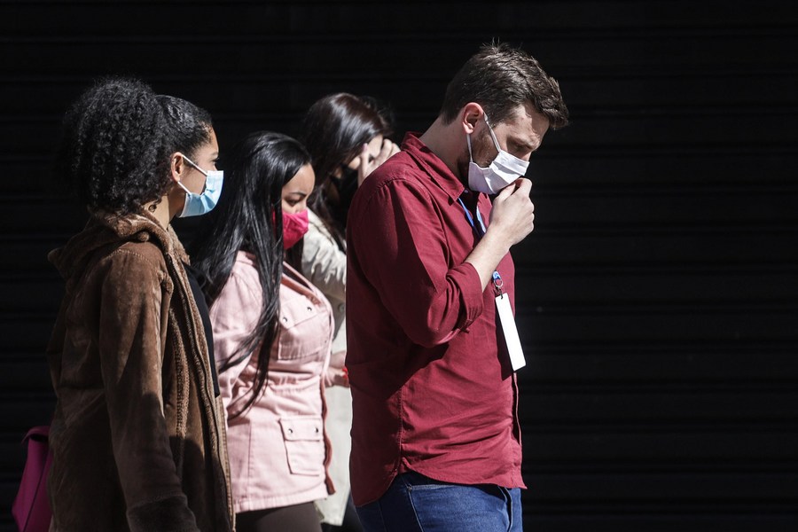 People wearing face masks are seen walking on a street in Sao Paulo, Brazil, on July 8, 2021. (Photo by Rahel Patrasso/Xinhua)
