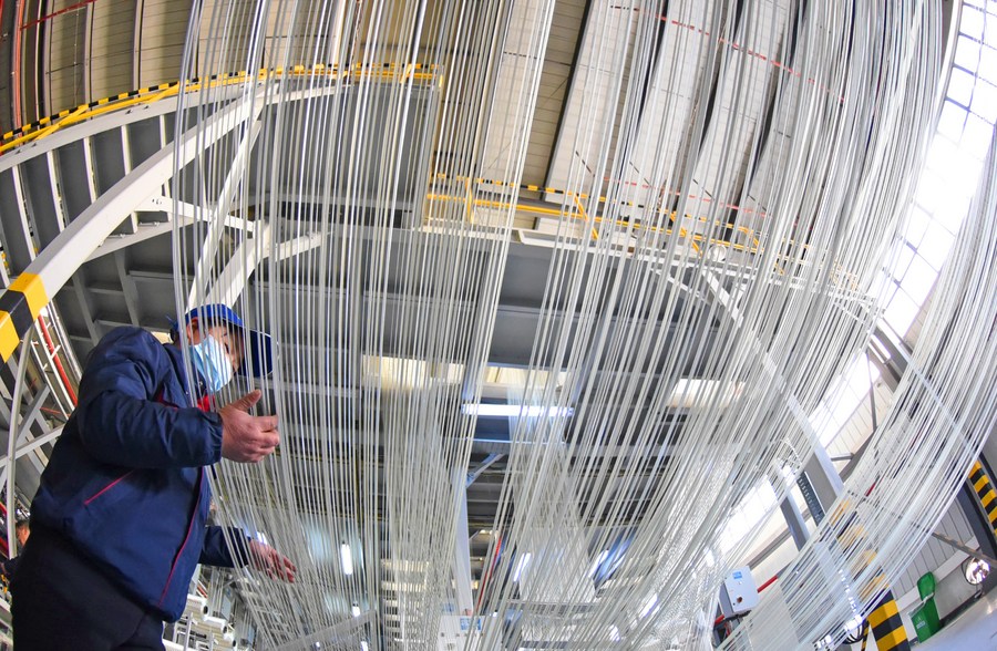 A worker checks the operation of a carbon fiber production line at the Lianyungang Economic and Technological Development Zone, east China's Jiangsu province, April 16, 2021. (Photo by Geng Yuhe/Xinhua)