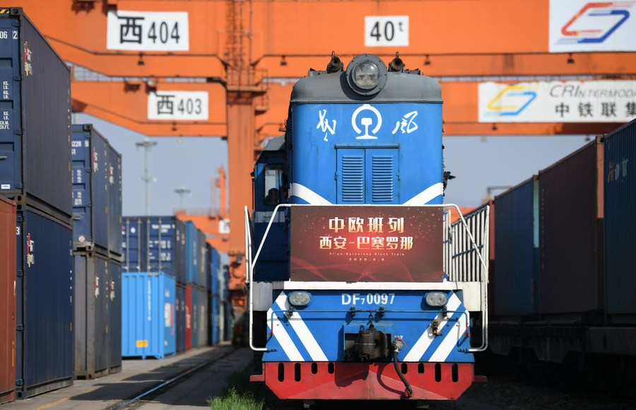 A China-Europe freight train bound for Barcelona of Spain waiting for departure in Xi'an, northwest China's Shaanxi Province, April 8, 2020. (Xinhua/Li Yibo)