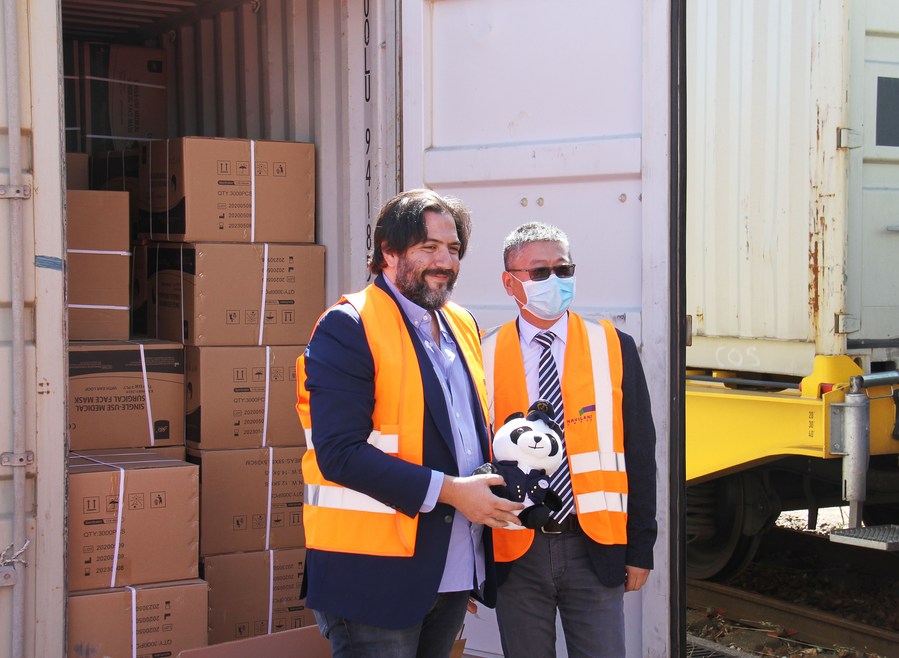 A policeman checks an outbound China-Europe freight train at Horgos Pass in northwest China's Xinjiang Uygur Autonomous Region, April 20, 2020. (Photo by Zhang Jia/Xinhua)