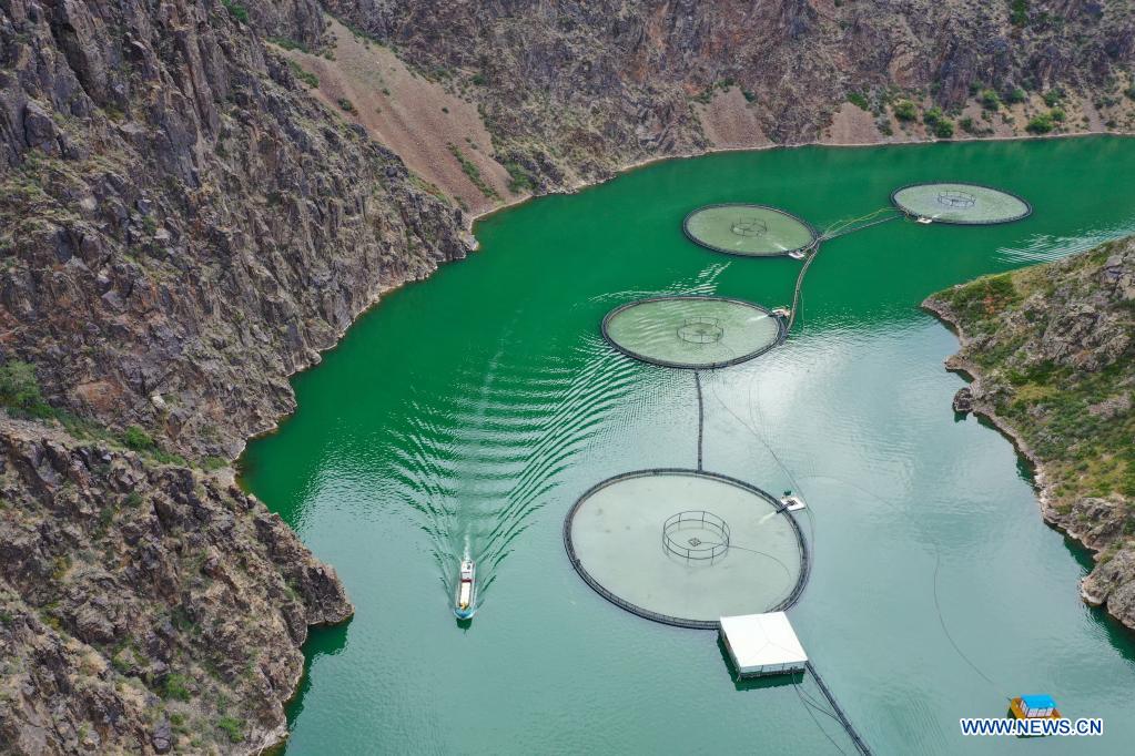 Aerial photo taken on June 17, 2021 shows a salmon farming base in Karasu Township, Nilka County, Urumqi, northwest China's Xinjiang Uygur Autonomous Region. Adhering to the "people-centered" philosophy of development, Xinjiang has witnessed a brisk growth in both its economy and social affairs. With steadily increased input in projects for public well-being, people of all ethnic groups now have equal opportunities to develop their careers, to contribute to regional construction, and to share a happy life and effectively ensured economic rights. (Xinhua/Ding Lei)