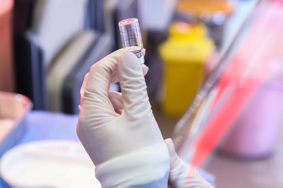 A medical worker prepares a dose of COVID-19 vaccine on a mobile vaccination vehicle outside the Donghua Gate of the Palace Museum in Beijing, capital of China, April 13, 2021. (Xinhua/Zhang Yuwei)