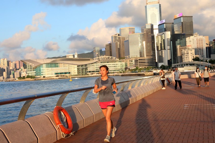 Photo taken on July 8, 2021 shows a citizen running at Tamar Park in Hong Kong, south China. (Xinhua/Wu Xiaochu)