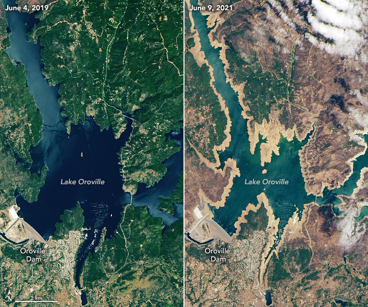 Images taken by NASA satellites show Lake Oroville in California, the United States, on June 9, 2021 and June 4, 2019, highlighting the effects of drought. (Photo credit: NASA Earth Observatory)