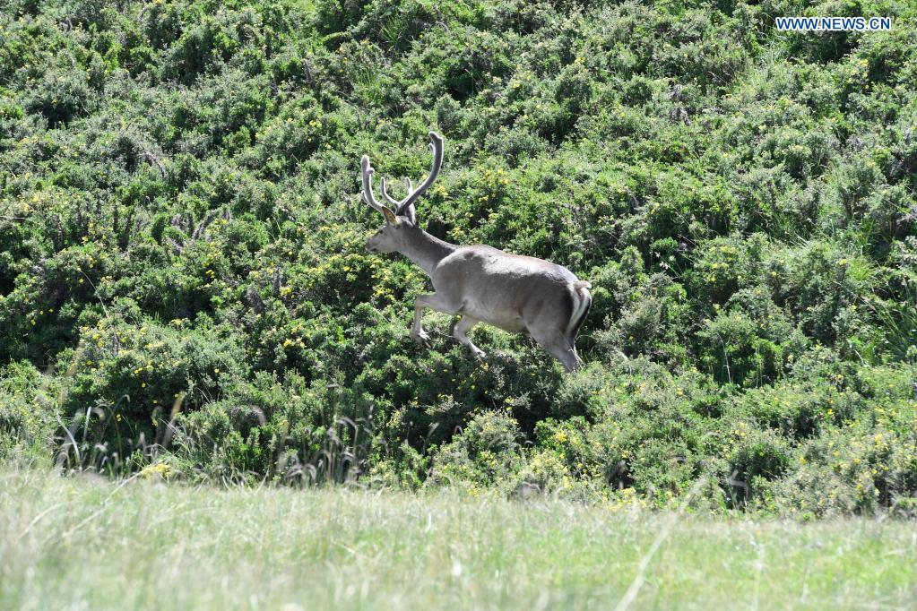 Photo taken on July 17, 2021 shows red deer at a cultivation field in Sunan Yugur Autonomous County, northwest China's Gansu Province. More than 500 red deer live in the cultivation field of Sunan Yugur Autonomous County that is located on the valley of the Qilian Mountain at an altitude of 2,700 to 3,000 meters. (Xinhua/Fan Peishen)