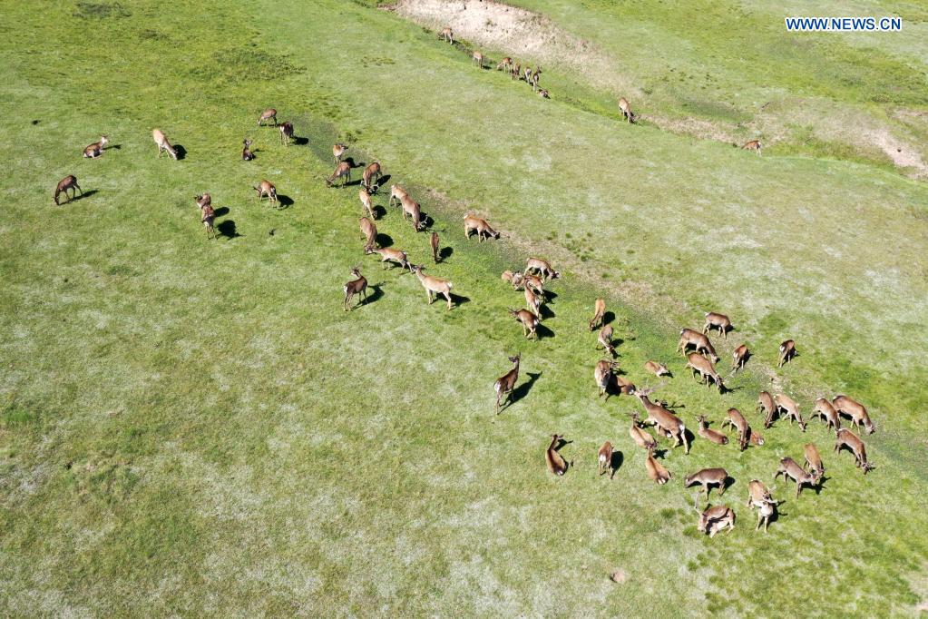 Aerial photo taken on July 17, 2021 shows red deer at a cultivation field in Sunan Yugur Autonomous County, northwest China's Gansu Province. More than 500 red deer live in the cultivation field of Sunan Yugur Autonomous County that is located on the valley of the Qilian Mountain at an altitude of 2,700 to 3,000 meters. (Xinhua/Fan Peishen)