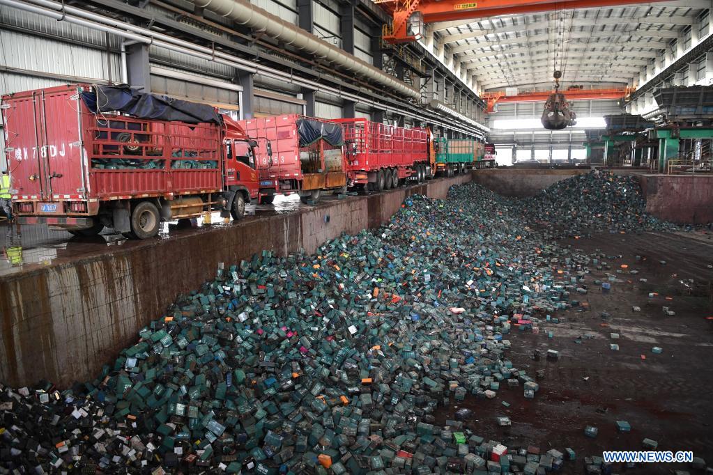 Waste batteries are pooled for recycling at Tianying technology park in Jieshou, east China's Anhui Province, July 15, 2021. At Tianying technology park in Jieshou, materials such as lead and plastics found in waste batteries are reused through a series of processes. To promote circular economy, Jieshou has built one of the largest power battery recycling and production bases in China with a full-fledged recycling system and related industries. Each year, the city recycles 1.6 million tonnes of waste batteries. (Xinhua/Liu Junxi)