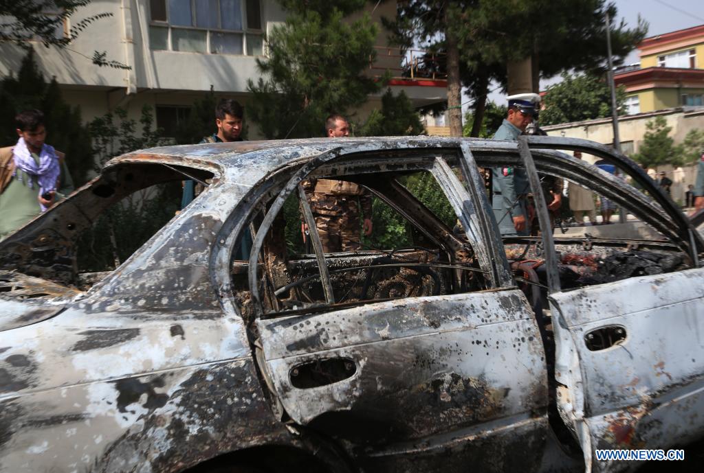 Photo taken on July 20, 2021 shows a damaged vehicle from which rockets were fired in Kabul, Afghanistan. Several rockets were fired on Tuesday at the presidential palace in Kabul, but failed to hit the target, officials and media reports said. (Xinhua/Rahmatullah Alizadah)